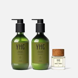 Мыло для рук, 300 мл: мягкое очищение с зелёным древесным аккордом; формула с производными кокоса и маслом конопли;  без пересушивания, с лёгким ароматом. Крем для рук, 300 мл: интенсивное увлажнение и защита без липкости; глицерин, триглицериды и масло конопли; подходит для частого применения.  Диффузор, 50 мл: длительное действие, 5-6 месяцев стойкого аромата — подходит для помещений до 30 м²: без спирта, 5 фибровых палочек в комплекте.